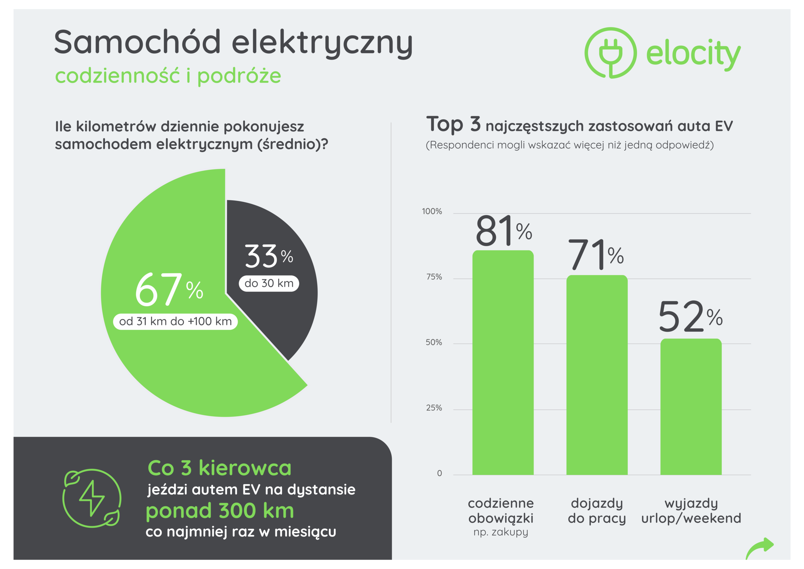 Dane w Raporcie tylko to potwierdzają. Większość użytkowników elektryków porusza się w typowym rytmie dnia, pokonując dystanse odpowiadające codziennym potrzebom. Nawet dłuższe trasy przestają być wyjątkiem. Elektryk nie ogranicza mobilności, tylko naturalnie się w nią wpisuje.